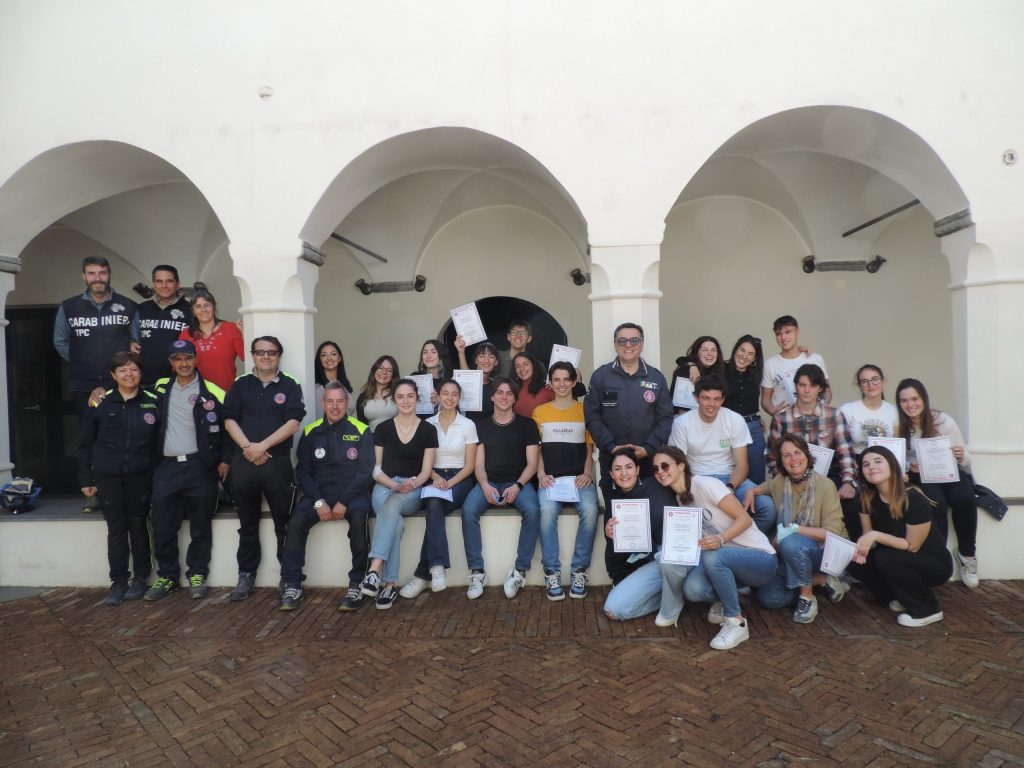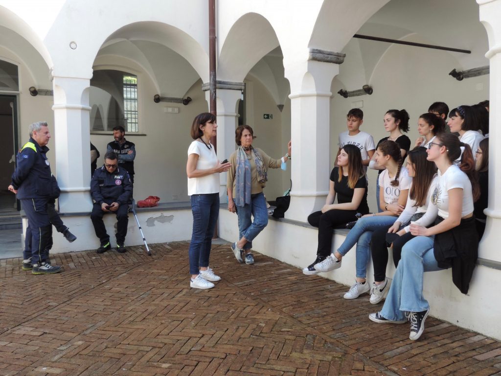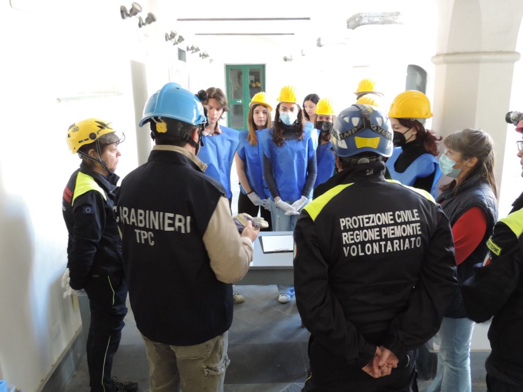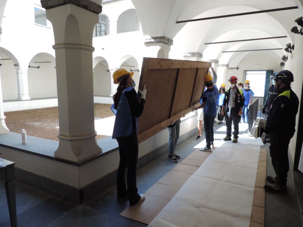 Grazie alla collaborazione con la Associazione di Protezione Civile, i ragazzi hanno avuto in dotazione caschetti di protezione, guanti, pettorine, e la strumentazione per poter imballare le opere recuperate nella chiesa (carta a bolle, metri, macchine fotografiche per le fotografie, schede ministeriali per la catalogazione dei beni). Le opere recuperate (trattandosi di una simulazione le opere sono simulacri di finzione e quindi di non interesse culturale) sono state portate nel chiostro dell’Abbazia e sono state dagli studenti misurate, fotografate, schedate (riportando all’interno di appositi moduli tutti i dati necessari per il riconoscimento), avvolte con materiale di protezione e portate in un deposito sicuro all’interno dell’edificio. Naturalmente tutte le operazioni sono avvenute sotto la supervisione del Nucleo Carabinieri Tutela del Patrimonio Culturale, dei funzionari del Ministero della Cultura e con la collaborazione della Associazione volontari di Protezione Civile “Proteggere insieme”.