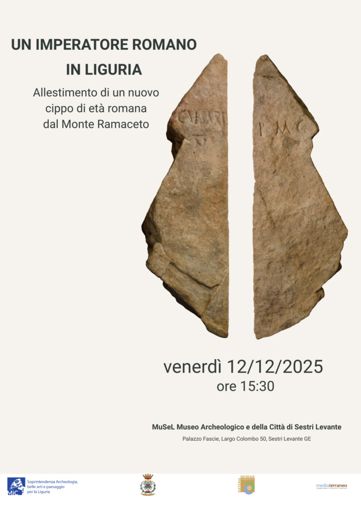 Si invitano gli interessati all’Evento organizzato da Soprintendenza Archeologia, belle arti e paesaggio per la Liguria con il Comune di Sestri Levante, che avrà luogo venerdì 12 dicembre presso il MUSEL Museo Archeologico e della Città di Sestri Levante (GE) in occasione dell’allestimento del cippo iscritto, segnale di confine di età imperiale, recuperato nel 2024 nell’alta Val Fontanabuona, in provincia di Genova. Assieme ad un primo cippo, rinvenuto nel 2015 nella medesima zona, esso costituisce una rilevante testimonianza superstite in Italia.